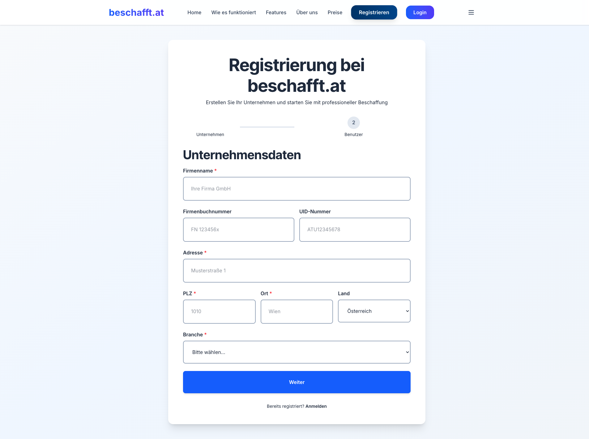 Füllen Sie alle Felder im ersten Schritt aus und wählen Sie Ihre Branche. Klicken Sie auf "Weiter".